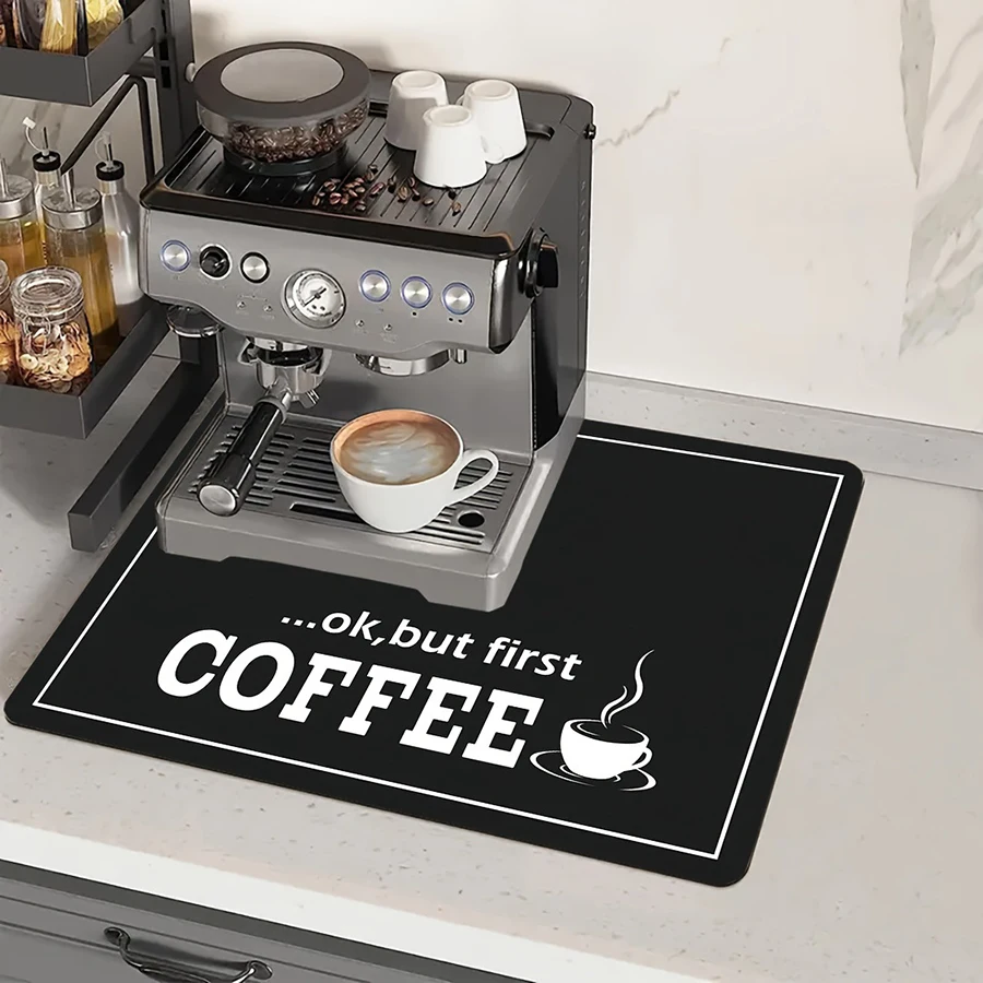 Keep your kitchen counter clean and dry with this black letter coffee machine mat. Featuring a modern minimalist coffee print, it adds style to your coffee station. The mat is designed for quick water absorption to catch drips and spills. Made from high-quality, durable materials that are easy to clean. Perfect for placing under coffee machines, cups, or other kitchen appliances. Its compact size fits well on any countertop or coffee bar. The black background with coffee-themed print complements various kitchen styles. Prevents water damage and keeps surfaces dry during your coffee routine. Lightweight and easy to move or store when not in use. A practical and stylish addition to any coffee lover’s kitchen.